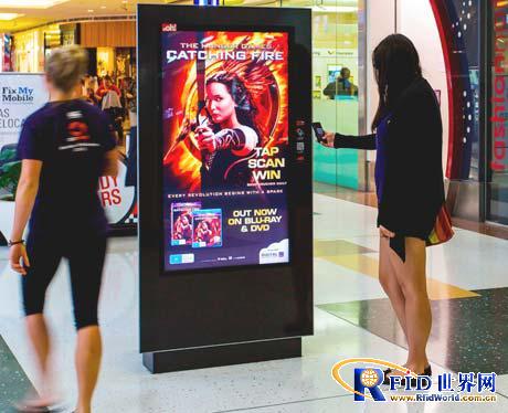 在最新特許發行的《饑餓游戲》電影DVD正在澳大利亞的購物中心通過數字媒體展板進行推廣。顧客可用他們的手機來訪問基于電影的一個游戲,讓背景“起火”。