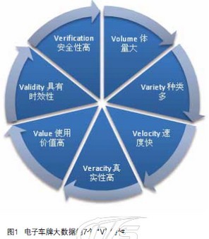 相較于上文提到的國外科學家對大數據特性普遍的4個“V”的定義,筆者認為在電子車牌大數據方面應該有全新的理解,而且應當增加至7個,分別是:體量大(Volume)、種類多(Variety)、速度快(Velocity)、真實性高(Veracity)、使用價值高(Value)、具有時效性(Validity)、安全性高(Verification)。具體如圖1所示。