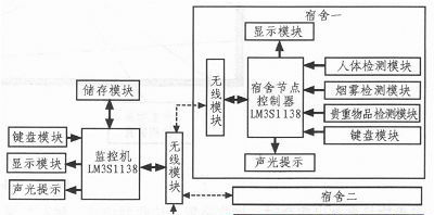 系統結構框圖如圖1所示。本系統主要通過宿舍內的節點控制器LM3S1138單片機采集人體紅外檢測模塊、煙霧檢測模塊、貴重物品出入檢測模塊產生的數據信息,經過處理實現LED閃爍和語音警報功能,利用鍵盤輸入密碼可以解除警報。宿舍節點控制器與監控機利用無線通訊傳送監控數據,實現異地監控及多個宿舍的網絡控制。監控機可將數據信息儲存在24C256芯片為核心的儲存模塊并記錄近幾天宿舍安防情況,通過顯示模塊顯示。