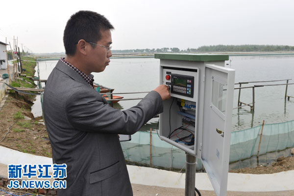螃蟹養殖戶呂爭虎在操作水產溶解氧智能監控設備。