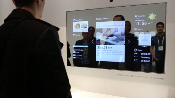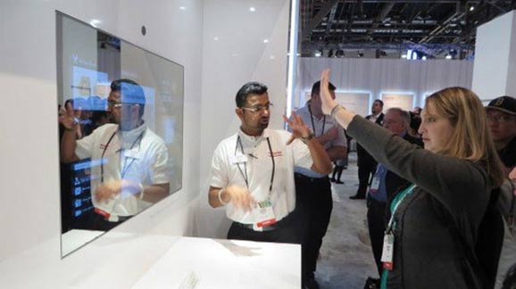在今年的CES展會上,東芝展出了這款“Multi Display in Black Mirror”。鏡子表面如同普通浴室鏡,但鏡面其實就是一個顯示屏。