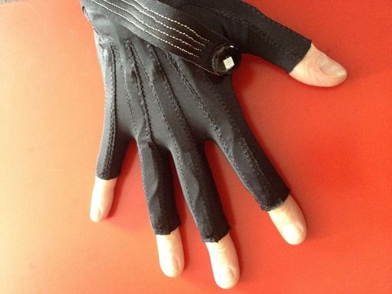 從外觀上看,Mi.Mu智能手套與傳統手套有著非常大的不同,產品有手套和腕帶兩部分組成,其中手套部分采用了露指和露掌心的設計,每個手指上都安裝了柔性傳感器,能夠準確地撲捉用戶手指的動作,同時,手套的虎口處還有一個LED指示燈,可以實時顯示音樂的演奏狀態。腕帶是Mi.Mu智能手套最為重要的部分,手指動作數據的接收、轉換和再發送都通過腕帶上的x-OSC無線電路板處理完成,該電路板內置了低功耗的Wi-Fi模塊、陀螺儀和加速器等,能夠與電腦實現手指數據的互傳互收。