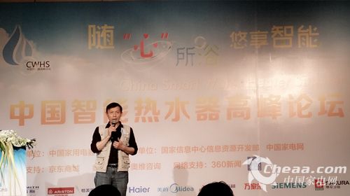 中國家用電器研究院副總工程師張亞晨在“中國智能熱水器高峰論壇”上發表演講(圖)
