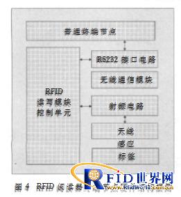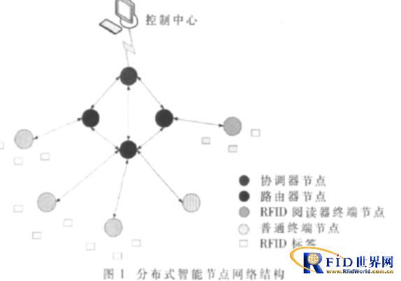 RFID系統和WSN系統作為單獨作用的系統而言,其體系架構都已經比較成熟了,但對于兩者集成的體系架構研究才剛剛開始。對于目前RFID系統中的讀寫器來說,只能在本地控制系統的控制下工作,其龐大的體積和昂貴的價格限制了它的移動和大量布置。而且,RFID讀寫器的天線必須仔細地設計,以便可以覆蓋到范圍內所有的標簽,還要防止不同讀寫器天線之間的碰撞。這些不利因素都限制了RFID的進一步應用。如果能夠削減RFID讀寫器的部分功能,可以使得讀寫器成本降低且更容易布置。因此,本文采用一種分布式智能節點結構[1],其結構如圖1所示。