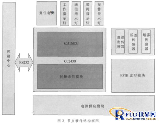 在系統中,利用RFID標簽來記錄危險物品的詳細信息和位置信息,并實時與RFID閱讀器節點進行信息交互;配置了各種傳感器的普通終端節點來檢測裝載危險品的容器的相關重要指標,可以主動記錄對象的溫濕度、煙霧、壓差等環境信息,并實時上傳感知信息。Zigbee傳感器網絡注重某個區域的感測指標,而RFID技術能夠準確地識別具體的節點信息并進行位置監控。綜合兩者的技術特點,基于傳感器網絡的RFID監控系統能夠主動、實時地對環境進行檢測并準確地記錄具體節點的相關數據,必要時能夠主動發出警報。系統主要實現環境信息傳感、危險物品位置檢測以及安全告警等功能,系統實現中主要包括了組網分析、Zigbee RFID無線傳感網絡硬件實現和監控中心管理軟件設計三大部分內容,最后給出了本設計的實驗室樣機網絡系統及驗證結果。