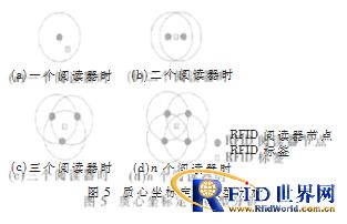 圖5(a)表示標簽只被一個閱讀器識別,圖5(b)表示標簽被兩個閱讀器識別,圖5(c)表示標簽被三個閱讀器識別,此時標簽(TagPtX,TagPtY)同時位于三個讀取器的有效射頻識別范圍內,則取以三個讀取器為頂點的三角形的質心為標簽的坐標。這樣計算的一個假設同樣是依據標簽在重疊區域依均勻分布出現。圖5(d)表示標簽被n個閱讀器識別,此時標簽(TagPtX,TagPtY)同時位于n個讀取器的有效射頻識別范圍內,則取以n個讀取器為頂點的多邊形的質心為標簽的坐標。這樣計算的一個假設同樣是依據標簽在重疊區域依均勻分布出現。此時標簽(TagPtX,TagPtY)的坐標與同時識別它的n個讀取器Reader A(ARdrPtX,ARdrPtY)、Reader B(BRdrPtX,