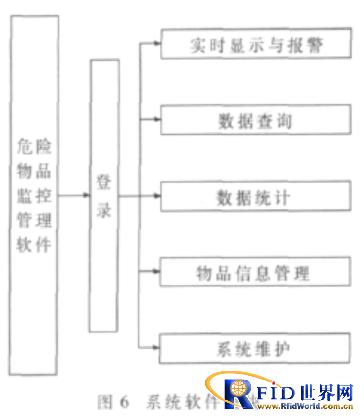 危險物品監控管理軟件實現對危險物品跟蹤定位信息的采集、分析處理、實時顯示、數據庫存儲、報表打印等功能。軟件是采用 Microsoft的Visual C++6.0開發的集數據采集與信息處理于一體的綜合管理系統。本系統采用以SQL Server2000數據庫為主的 C/S模式開發而成,共有操作員登錄、實時顯示、數據查詢、數據統計、物品信息管理、系統維護6個模塊,如圖6所示。