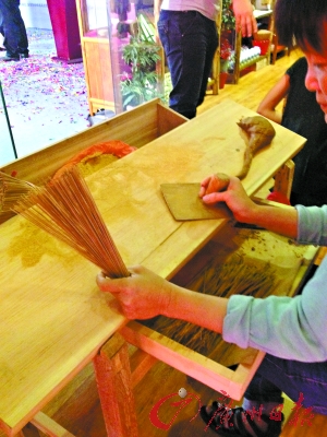 而在巷子坊的慈航香舍,正上演一場“手搓香”的傳統工藝,演示者將一根直徑只有0.8毫米的竹簽,用香搓板搓上一團泥,就成了檀香。不過這團泥可不是泥巴,而是用檀香粉、水及一些配料按照比例和成。據店家說,手搓香工藝在中國已有悠久的歷史。