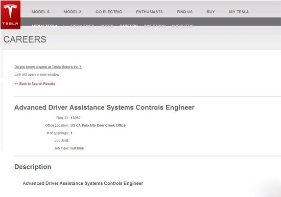 特斯拉官網招聘先進駕駛輔助系統控制工程師