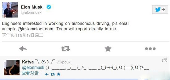 盡管特斯拉官網已經刪除了前述招聘啟事,然而到9月18日,特斯拉CEO艾隆·馬斯克(Elon Musk)發布了一條Twitter:“有意致力于自動駕駛研究的工程師請發電子郵件至autopilot@teslamotor.com,團隊將直接向我匯報。”