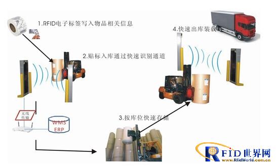 每個紙卷成品入庫前貼有已寫入相關產品信息的電子標簽,叉車經過RFID自動識別通道,產品及車輛信息自動批量讀取,信息實時上傳至管理中心,叉車進入倉庫存放好貨物讀取庫位標簽,信息WIFI實時上傳。