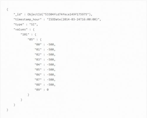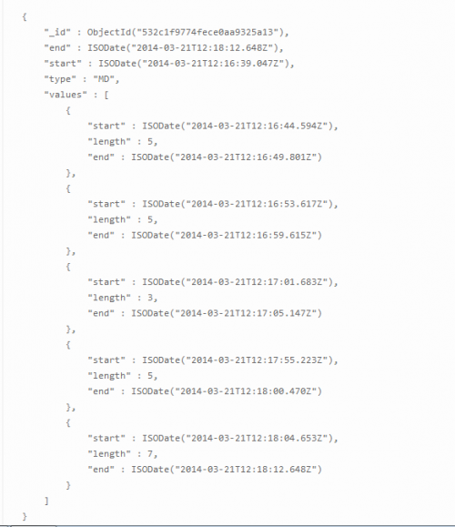 第二個類型的數據(事件驅動/觸發)以類“bucket”文檔模式存儲。針對每個傳感器的類型,需要預先為值分配固定數量的條目(一bucket分配100個)。當事件發生時,將其寫入這些文件中,每個事件對應100個條目組的一個子文檔,子文檔貫穿著事件的始終。當記錄/事件第一次被寫入到文檔中時,全部文件獲取與開始日期對應的時間戳。每次寫入到數據庫時,應用程序都會檢查當前記錄是否已經寫入到當前文檔,如果寫入已經完成,它會設置文檔的結束日期/時間并啟動引導到下一文檔的寫入。