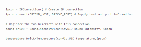 Tinkerforge傳感器帶有多語言版本的API,我們決定使用Python,在連接傳感器的Raspberry Pi上運行腳本,數據則寫入到MongoSoup托管的MongoDB實例中,MongoSoup是我們的MongoDB即服務解決方案。通過API注冊例如聲音強度和溫度bricklet,你需要執行下列操作: