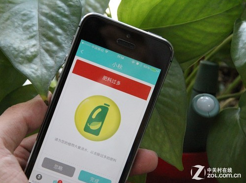 除了具有實時監測以外,其還能進行周期性數據監測,并且提示用戶澆水、施肥等工作。在周期性監測數據中,我們可以等待24小時之后,就能看到土壤的肥料水平。在我們測試過程當中,由于花盆中肥料過多,應用程序通過推送提示的方式,建議用戶澆水進行沖洗土壤。