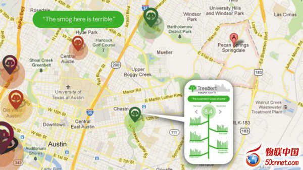 這樣的技術可以增加智能城市中公共交通的乘客量,因為他們讓市民上下班更加方便和愉快。Frog公司的一些其它概念更注重通過使用可穿戴設備讓人們更了解環境問題。, 例如,“Tree Voice”是一個關于德克薩斯奧斯丁市樹木的網絡顯示器,通過系在樹上的顯示屏和可以展示數的未來的移動程序,闡述了不同環境因素對樹的影響,比如說干旱、污染、化學物質等(見下圖)。