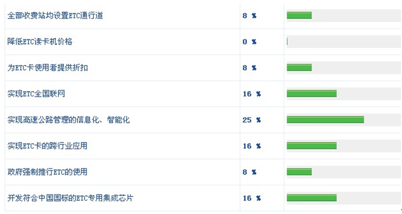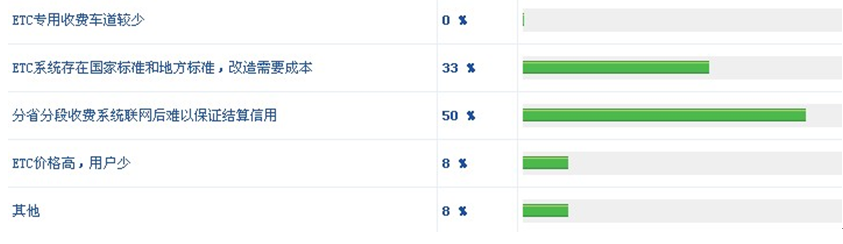 從網友的回答看,"降低ETC讀卡機價格"沒有人選,"為ETC卡使用者提供折扣"只有8%的比例,說明由于ETC的種種優點,人們對ETC的認可度比較高,用戶在價格方面并不敏感。從增加ETC通行道、實現全國聯網、實現ETC卡跨行業應用到高速公路管理的信息化,這些選項都與高速公路運營管理有關,說明ETC的普及還需要從管理方面著手。