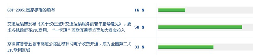 隨著國家標準GB/T20851《電子收費專用短程通信》在2007年3月17日的正式發布和交通部門的大力宣貫的推廣,中國ETC行業有了自己的國標。國內先后有十幾家企業的產品通過了ITS中心的專業檢測,且已形成較為完善的ETC產業鏈。而交通運輸部發布《關于改進提升交通運輸服務的若干指導意見》,要求各地政府在ETC聯網、"一卡通"互聯互通等方面加大資金投入的政策。各地政府很快對這一政策做出了反應,比如江西省交將力爭ETC覆蓋率超過90%,河北省則規劃2014年底全省高速公路收費站100%建有ETC車道,天津市也將在年內基本實現天津高速公路所有收費站均有ETC車道。這些舉措直接推動了ETC系統的發展。同時,ETC聯網也獲得政策支持,規模效應也有力促進了ETC產業的發展。