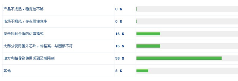 而當問到"您認為ETC市場推廣的瓶頸最主要是什么"時,16%的網友認為是"尚未找到合適的運營模式",16%的人認為是"大部分使用國外芯片,價格高、與國標不符",58%的網友則認為是"地方利益導致使用受到區域限制",另有8%的網友選擇了"其他"。至于產品方面的原因如"產品不成熟,穩定性不夠"與"市場不規范,存在惡性競爭"則沒有人選。(見圖5)