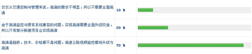 當問到"您認為高速公路視頻監控是否會實現高清化"時,10%的網友認為"僅僅從交通控制與管理來說,高清的需求不明顯,所以不需要全面高清",20%的網友認為"由于高清監控與原有系統兼容的問題,實現高清需要全面升級改造,所以只有部分新建項目會實現高清",70%的網友認為"高清是趨勢,技術、價格都不是問題,高速公路視頻監控都將升級為高清"。(見圖13)