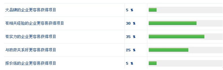 在問卷最后,當問到"您認為什么樣的企業更容易獲得高速公路監控項目"時,5%的網友認為"大品牌的企業更容易獲得項目",5%的網友選擇"報價低的企業更容易獲得項目",25%的網友選擇"與政府關系好更容易獲得項目",30%的網友則認為"有相關經驗的企業更容易獲得項目",但仍然有30%的網友相信"有實力的企業更容易獲得項目"。(見圖14)