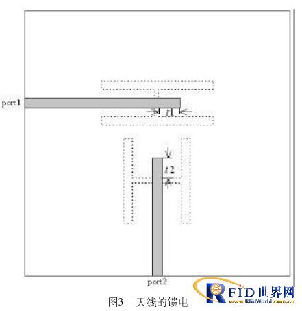 在天線的底層下是饋電層,在本設計中饋電層是由50om的微帶線組成,微帶線的寬度為3.1mm。饋電層的俯視圖如圖3所示。圖中的t1=8.05mm,t2=11.95mm。