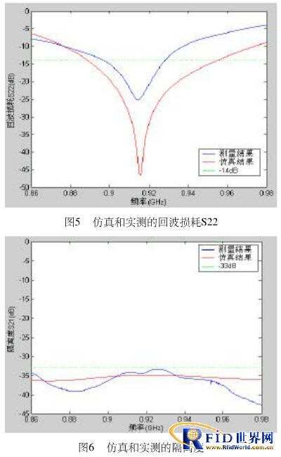從圖4、圖5和圖6中可以看出,回波損耗S11和隔離度的仿真結果和實測結果較為符合,而回波損耗S22的實測結果與仿真結果相差較大,不過其仿真結果和實測結果都已經滿足北美應用的帶寬要求(902MHz-928MHz)。