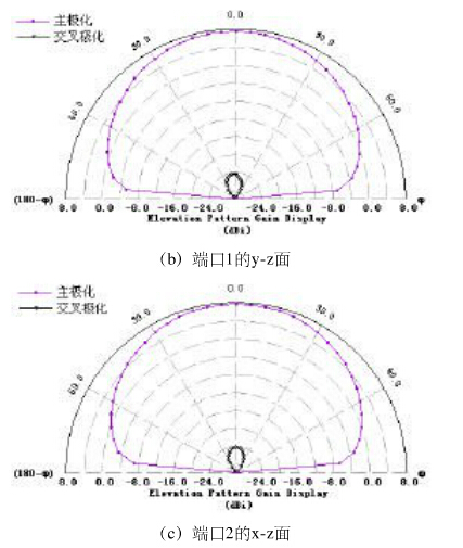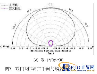 天線的輻射方向圖如圖7所示。圖7中示出了915MHz時端口1和端口2的兩個主平面輻射方向圖,可以看出得到了很好的輻射特性,交叉極化值也很小;天線增益大約為7.5dBi;仿真的天線效率大約為90%。通過端口1和端口2激勵,可以得到雙極化。