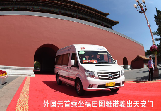 為隆重紀念中國人民抗日戰爭暨世界反法西斯戰爭勝利70周年,9月3日,中國政府在北京天安門廣場舉行了盛大的紀念活動及閱兵式,并首次邀請第二次世界大戰主要參戰國、亞洲國家和其他地區國家領導人、聯合國等國際組織負責人出席了現場活動,充分向世界展現了中國的軍事實力、經濟實力以及維護世界和平的決心。在本次紀念活動中,外交部授予福田汽車集團“中國人民抗日戰爭暨世界反法西斯戰爭勝利70周年紀念活動外事用車贊助單位”稱號,而福田商務汽車旗下圖雅諾成為外國元首轉場用車及副總統、重要級部長、外賓夫人接送用車,作為勝利日閱兵全新一代元首接待用車、北京汽車工業和中國民族工業創新力與實力的代表,圖雅諾秉承德國高端科技,鏈合全球優勢資源,各項性能均達到世界標準,組成了中國自主品牌的最強保障方陣,打造了中國自主品牌的新名片。”并以其卓越表現獲得了各國元首和外交使團的交口稱贊。