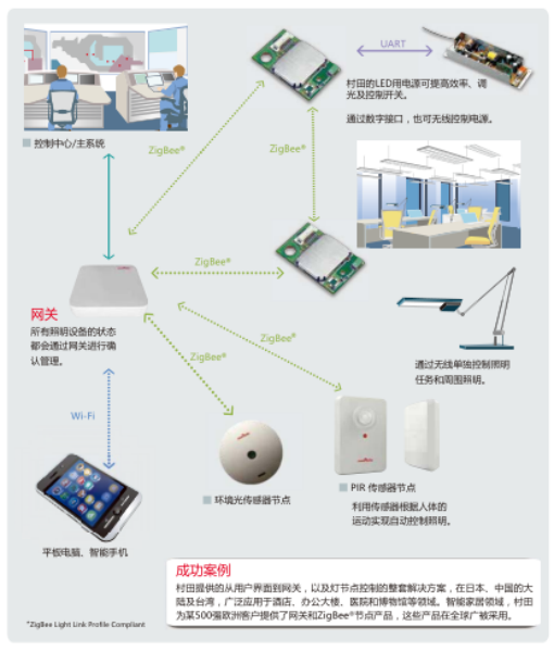 在IoT領域,村田推出了“智能照明系統解決方案”,將先進的無線通信技術、傳感器和云服務融入到整個照明解決方案,形成了高可靠的大網絡結構,實現“人走燈滅”、節能環保的目的,最大限度地節約能源。用戶還可基于場景、時間、區域同時控制不同種類的燈光,實現更舒適溫馨的生活空間。在日本、中國大陸及臺灣,村田提供的從用戶界面到網關,以及燈節點控制的整套解決方案,被廣泛地應用于酒店、辦公大樓、 醫院等眾多機構。