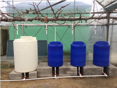 為以防水泵負擔過大,灌溉不均勻,造成不必要的損失,在七彩明珠水肥一體化智能灌溉應用中,愷易物聯網把每個種植棚設置為一個輪灌區,每個輪灌區可獨立控制灌溉,每次最大灌溉面積僅為一個輪灌區。在灌溉方式上,為每棵葡萄配兩個地插式果樹灌水器,而周邊蔬菜采用吊噴灌溉,經濟實用、操作簡單且美觀。
