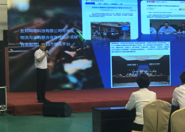 會上,遼寧友邦網絡科技有限公司CEO于添詳細介紹了友邦安達第四方物流平臺TMS系統和危化品運輸車輛專用的智能硬件設備。