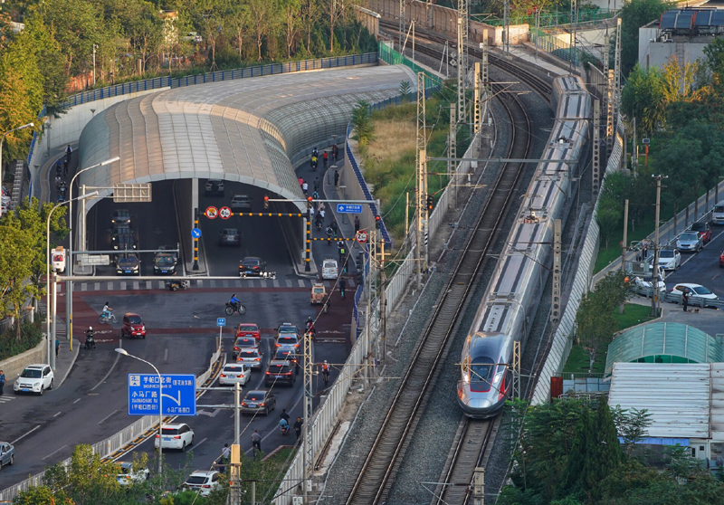 9月26日,C2701次列車駛過北京手帕口橋附近,從北京西站駛向大興機場站。