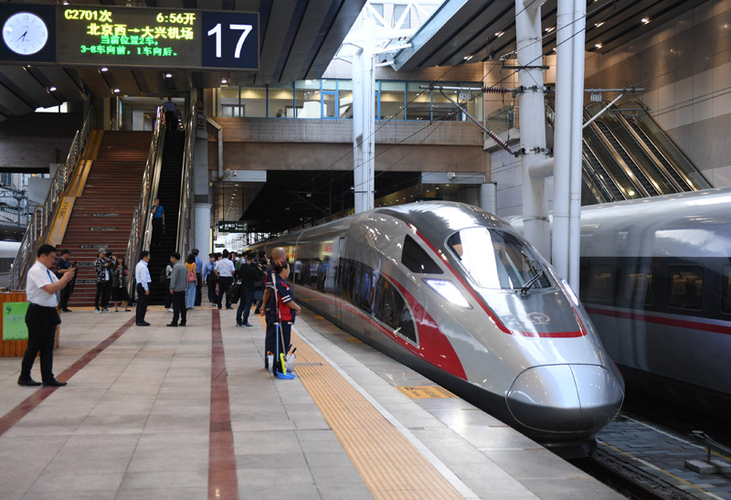 當日,京雄城際鐵路北京西至大興機場段開通運營,旅客從北京西站乘坐高鐵,最快28分鐘抵達大興國際機場。