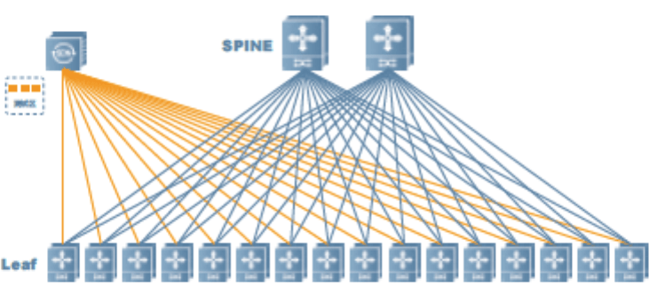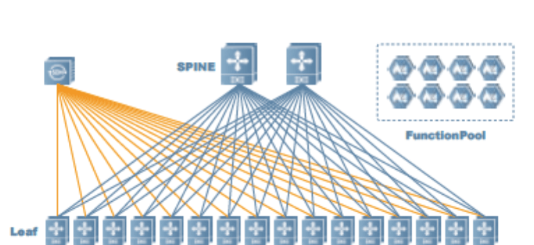 金融極簡網絡采用SPINE-LEAF 兩層架構,LEAF節點進行VLAN 與VxLAN 的映射,而SPINE 節點更多是進行不同VNI(VxLAN ID) 的互通。通過VRF 隔離的方式來構建真正像物理分區一樣的邏輯網絡分區。另外,通過旁掛安全設備構建網絡功能資源池,通過SDN 控制器將不同邏輯分區的流量進行引流,達到可按需為每個網絡功能區構建所需要的網絡功能(負載均衡/ 安全功能)的效果。