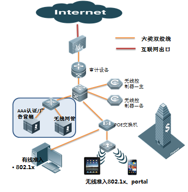 3)互(hu)聯網:包括外(wai)網信息發布、信息查詢等(deng)互(hu)聯網業(ye)務的網絡,對于無線(xian)(xian)接(jie)入(ru)、網關管理有(you)著較高的需(xu)求,通常涉及:認證(zheng)準入(ru)設備(bei),上網行為管理、無線(xian)(xian)設備(bei)、交換機(ji)等(deng)。