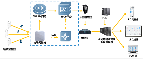 通過藍牙 ibeacon方式實現液體滴速與物聯網單元聯動,物聯網單元通過有線或者無線方式將數據轉發給銳捷ISCP平臺實現數據分析,與聯新軟件平臺對接進行業務展示,提供客戶所想信息。通過統計模塊,可實現輸液、患者、工作量、藥品使用情況和預警提示等相關數據整合,做到更好的支持臨床工作的安排和提高醫療服務質量。