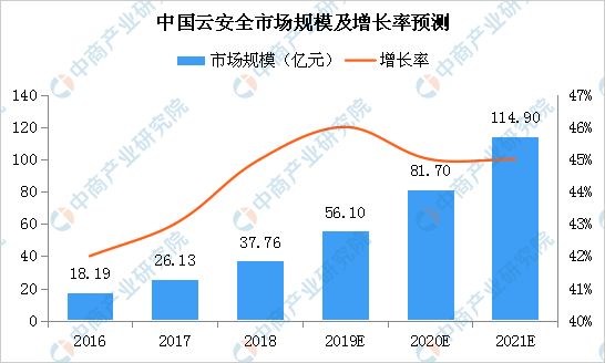 據數據顯示,2018年中國云安全市場規模達37.76億元,增長45%。隨著信息安全越來越受到重視,云安全市場將進一步擴大。預計2019年,中國云安全市場規模將達56.1億元,增長近五成。到2021年,預計我國云安全市場規模將超100億元。