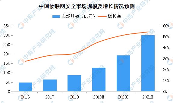 隨著應用不斷加深,未來物聯網市場的體量將持續擴大,物聯網安全市場迎來快速發展。據數據顯示,2018年中國物聯網安全市場規模超88億元,同比增長35%。隨著市場持續增長,預計2019年物聯網安全市場規模將近130億元。到2021年,物聯網安全市場規模將超300億元,漲幅超五成。