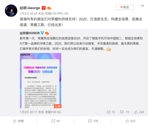 [ 導讀 ] 新京報訊(記者陸一夫)1月2日晚間,榮耀總裁趙明向員工發出新年信,表示2020年榮耀要打造有互聯網基因的全渠道品牌,“繼成為互聯網手機第一品牌后,2020全面開啟智能手機市場中國前二,智慧全場景和IoT第一品牌的沖鋒之路。”他透露,2019年榮耀體驗店的建設數量同比增長70%,專區專柜同比增長92%,智能穿戴產品規模同比增長超過340%,在俄羅斯的市場份額超過25%。趙明表示,華為和榮耀成為中國市…