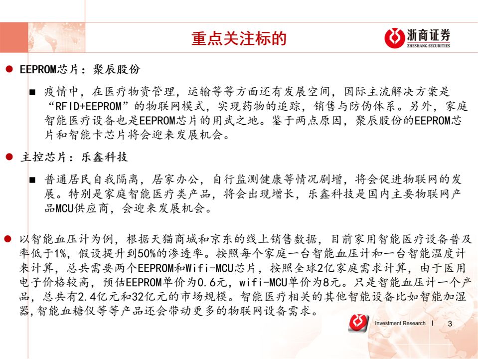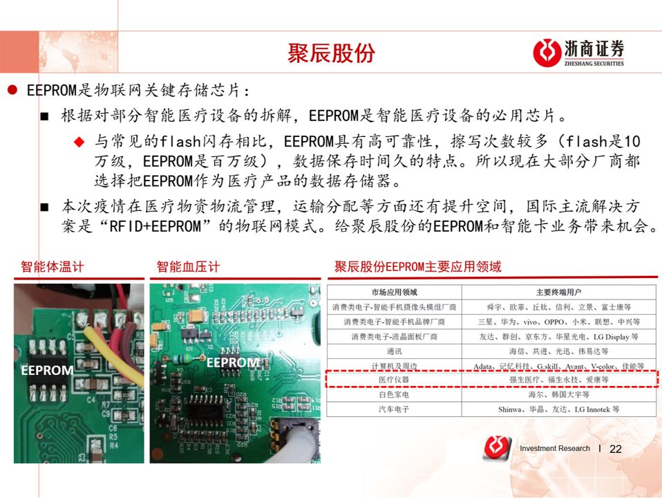 此次疫情在醫療物資管理,物流運輸方面還有提升空間,國際主流解決方案是“RFID+EEPROM”的物聯網模式,實現藥物的追蹤,銷售與防偽體系。另外,家庭智能醫療設備也是EEPROM芯片的用武之地。鑒于這兩點原因,聚辰股份的EEPROM芯片和智能卡芯片將會迎來發展機會。