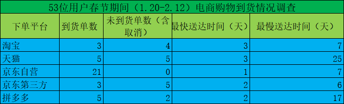 近期,全天候科技發起了一個針對春節期間(1月20日至2月12日)多家電商平臺快遞發貨情況的調查,有來自上海、廣州、邯鄲、蘇州、濟南、成都等地的53位用戶參與了調查。