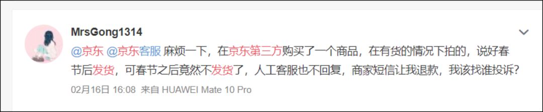 京東在春節期間也遭遇到發貨的問題,有不少用戶抱怨店鋪不發貨,甚至直接讓消費者申請退款。