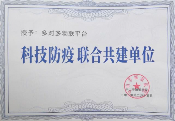 同日,中山博愛醫院授予多對多物聯平臺“科技防疫聯合共建單位”證書,明確雙方將進一步圍繞“物聯網+大健康”生態,共同建設城鄉健康聯防聯控體系,用更多行動踐行醫院責任與擔當,實現從“治病”到“防病”的轉變,持續給人們的健康生活帶來更多驚喜。