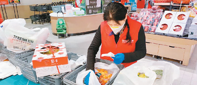 線上果蔬訂單增多,京東七鮮超市的工作人員正加緊分裝物品。