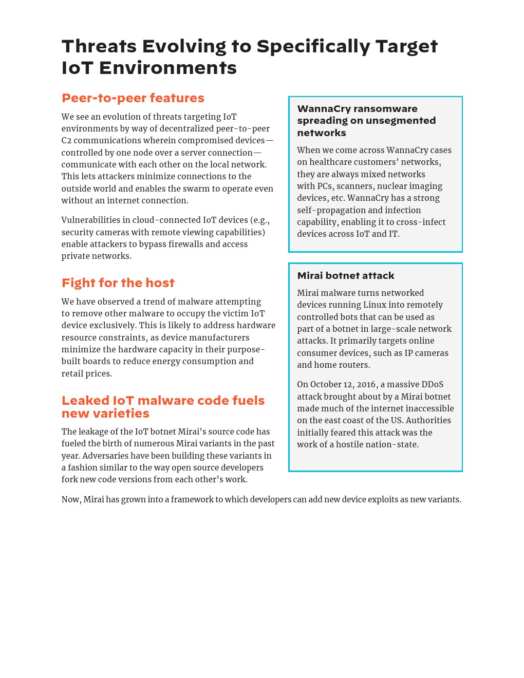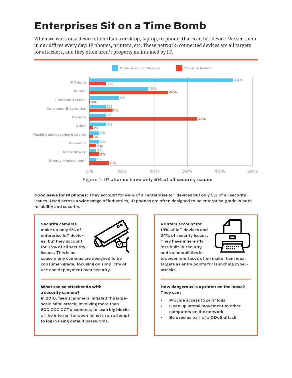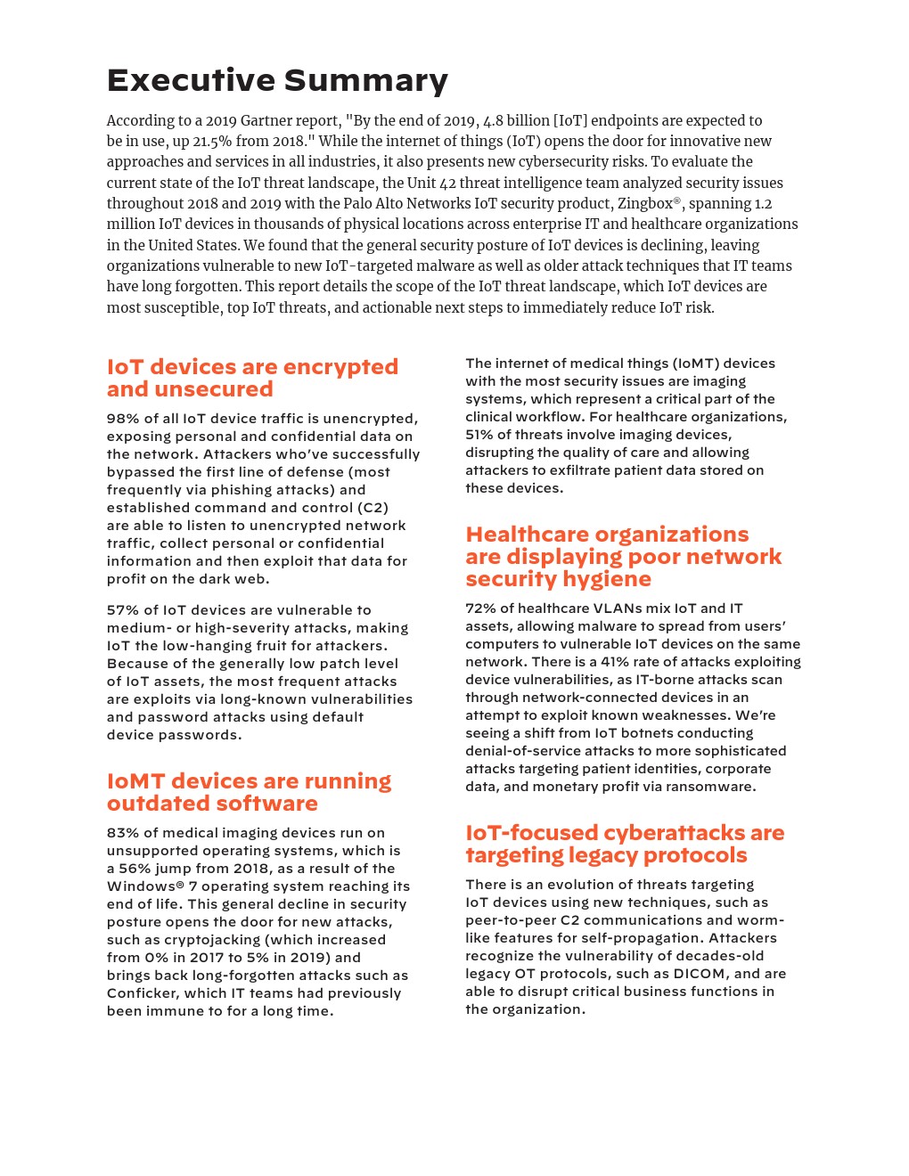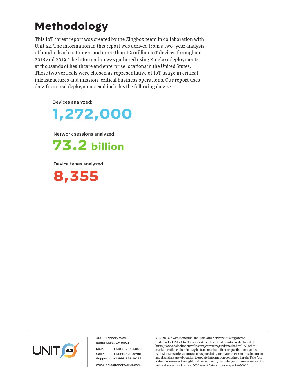 根據2019年Gartner的一份報告,到2019年底,預計將有48億個物聯網終端投入使用,比2018年增長21.5%。物聯網(IoT)在為所有行業創新和服務打開大門的同時,也帶來了新的網絡安全風險。為了評估物聯網威脅的現狀,Unit 24利用Palo Alto Networks物聯網安全產品Zingbox?分析了2018年和2019年的安全問題,該產品涉及美國企業IT和醫療保健組織中數千個物理位置的120萬臺物聯網設備。