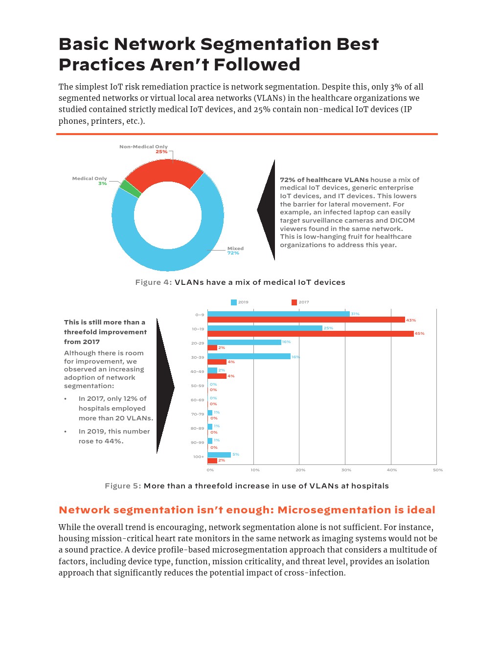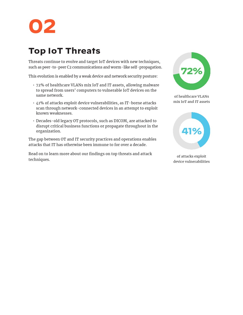 72%的醫療保健VLAN混合了物聯網和IT資產,使得惡意軟件能夠從用戶的計算機傳播到同一網絡上易受攻擊的物聯網設備。41%的攻擊利用設備漏洞,因為IT傳播的攻擊通過網絡連接的設備進行掃描,試圖利用已知的弱點。