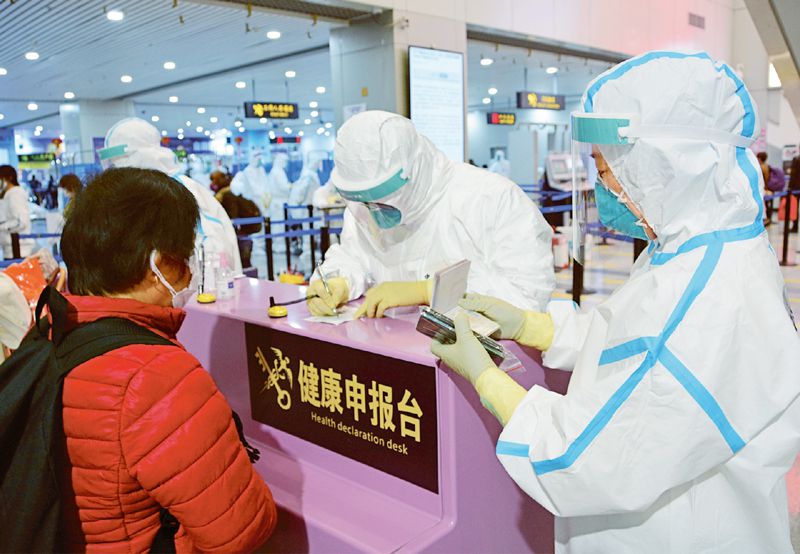 根據國內外疫情防控形勢變化,我國及時完善疫情防控策略和應對舉措,把重點放在外防輸入、內防反彈上來,保持我國疫情防控形勢持續向好態勢。圖為2020年3月27日,福州海關工作人員在健康申報臺為入境旅客服務。 新華社記者 魏培全/攝