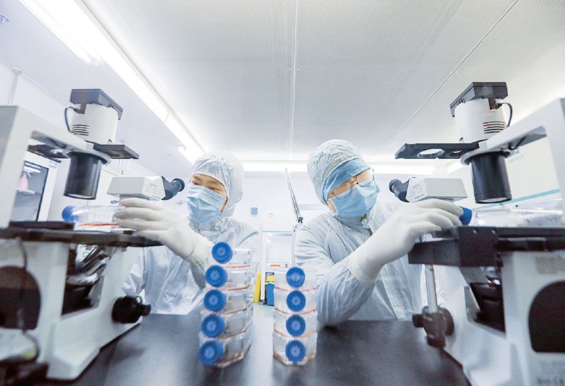 面對突發疫情,我國加大科研攻關,提高檢測和醫療救治水平,進一步加大衛生健康領域補短板力度。圖為2020年3月18日,位于浙江省湖州市南太湖新區的協和華東干細胞基因工程有限公司內,工作人員正在研制干細胞療法治療新冠肺炎的新技術、新方法。 人民圖片 陸一平/攝