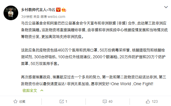 新浪科技訊 4月20日下午消息,馬云發布微博稱,馬云公益基金會和阿里巴巴公益基金會今天宣布和非洲聯盟(非盟)合作,啟動第三批非洲應急物資捐贈。這批物資將直接捐贈給非盟,由非盟和非洲疾控中心根據疫情發展和當地情況統籌物資分發,更加高效地支持非洲抗疫。