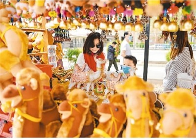 “五一”假期,甘肅省敦煌市在做好疫情防控的前提下,有序開放部分旅游場所。圖為在敦煌市鳴沙山月牙泉景區門口,游客們正在挑選當地特色小商品,歡度假日。 侯崇慧攝(人民視覺)